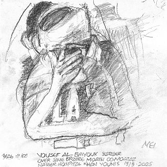 Yousef Al-Bayouk sørger over sine brødre Moath og Moataz, på Naser Hospital |