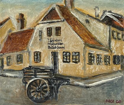 "Den Aalholmske Ejendom" (1800-tallet) Hjørnet af Mindegade og Dynkarken J. Svendsen Restauration British Crown Spånplade 23,5×27,5 cm |
