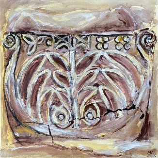 2015: Karolingisk terninge-kapitæl med livsrune, lilje, lotusblomst, gangetegn, hjulkors, livsstræ Omkr. 850 (40×40) |