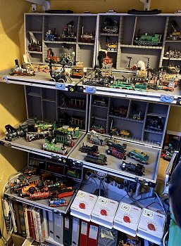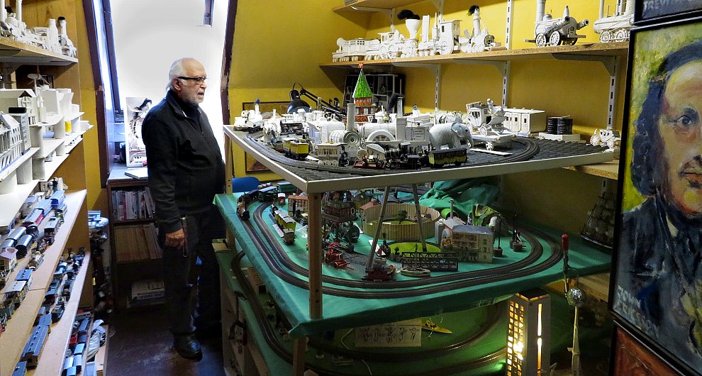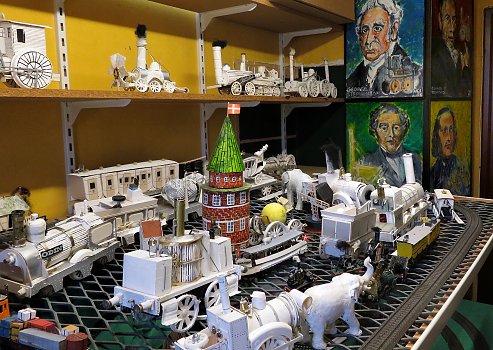 På den ledige plads mellem skinnerne og på hylder på væggene er fyldt op med Meisters egne modeller af lokomotiver og vogne foruden modeller af interessante stationsbygninger. Værelset rummer også en reol med relevant litteratur og en serie portrætter af klassiske jernbanekonstruktører.