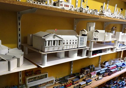 Pariserhuset i Jægergårdsgade, og flytningen til det lille loftsrum over præsteboligen er i sig selv et kunststykke! Modelbanen var oprindelig væsentlig større, og der var opbygget landskab omkring skinneforløbet. Landskabet måtte opgives, men størrelsen er klaret med små baner i tre etager.