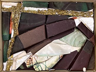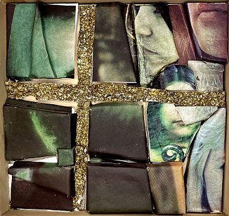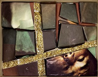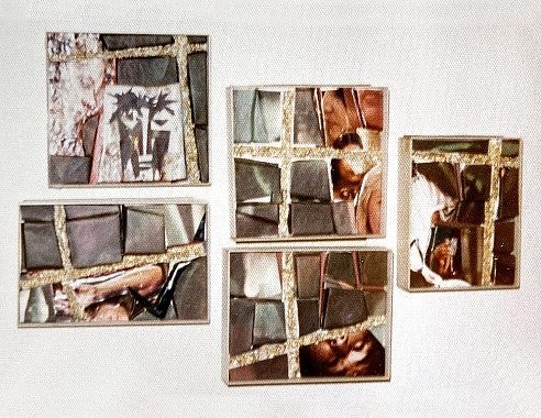 Collagerne er monteret i 15 flade kasser, alle i forskellige størrelser, med sider af trælameller fra en aflagt persienne og låg af plexiglas.
