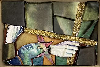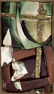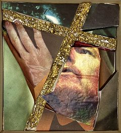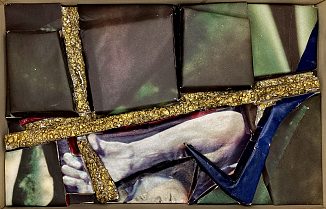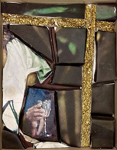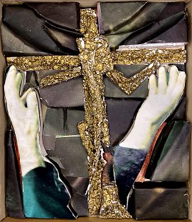 Fotos fra magasiner er klippet i stykker og limet på brudstykker af flamingo. De gennemgående kors er ligeledes udskåret i flamingo og bemalet med guldbronze. Det viste sig, at opløsningsmidlet i malingen "krympede" flamingoen, så de gyldne kors har fået en helt særlig rustik overflade.