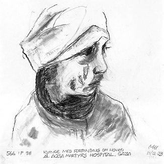 Kvinde med forbinding om hoved, Al Aqsa Martyrs Hospital, Gaza |