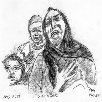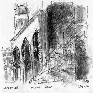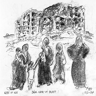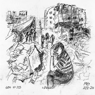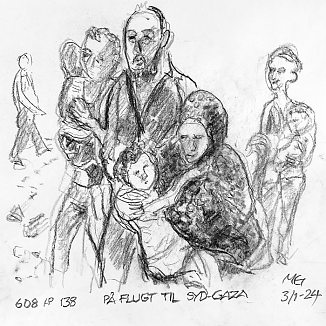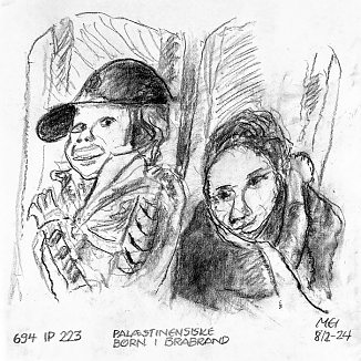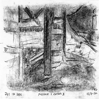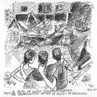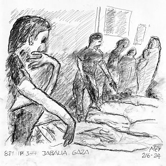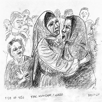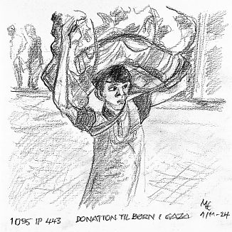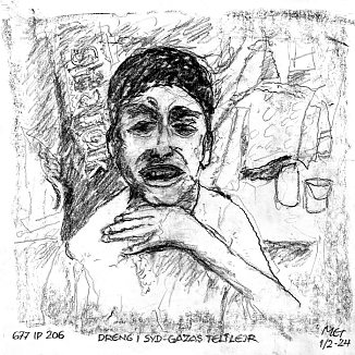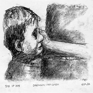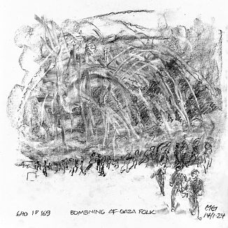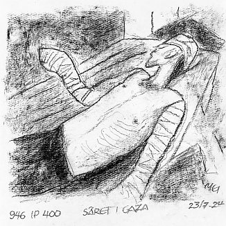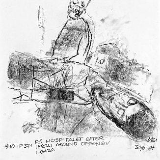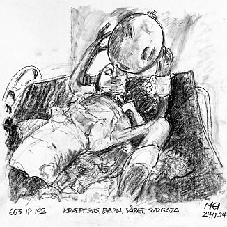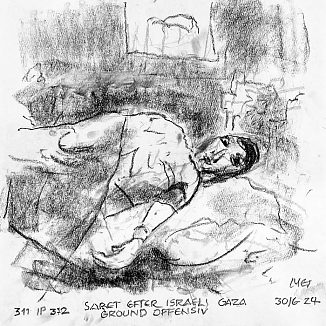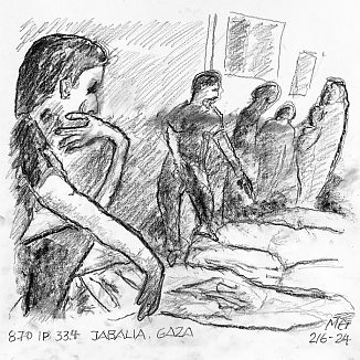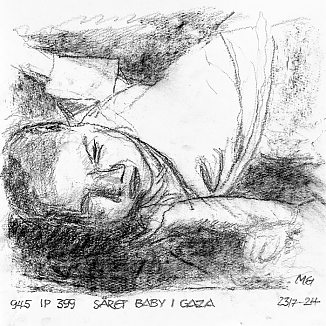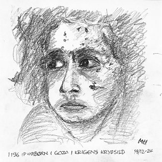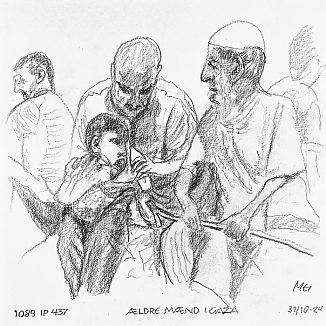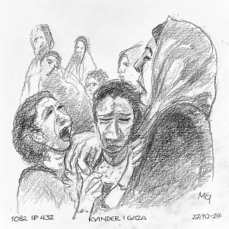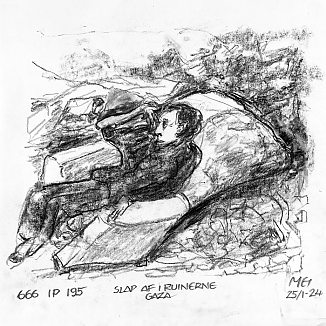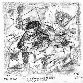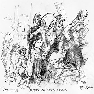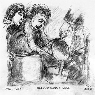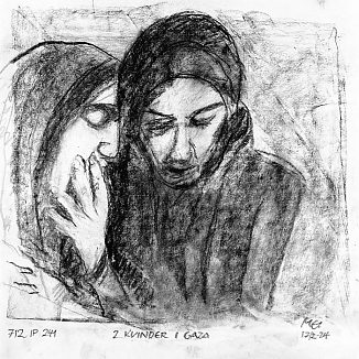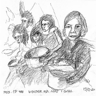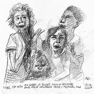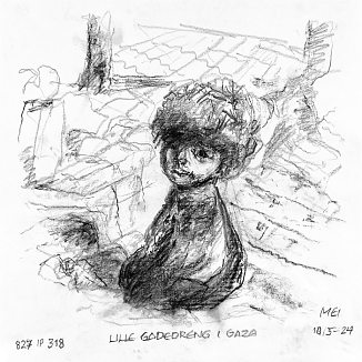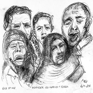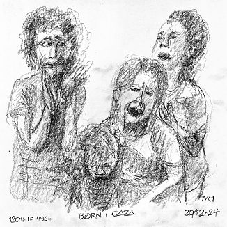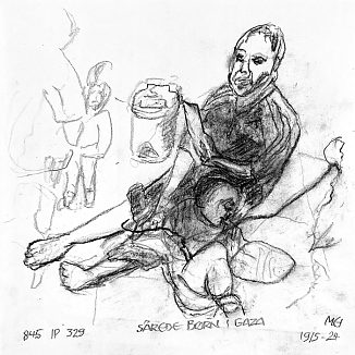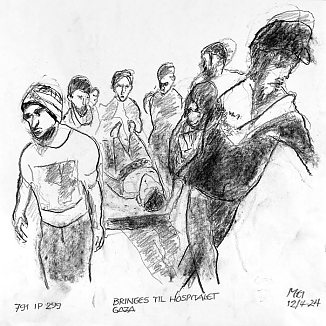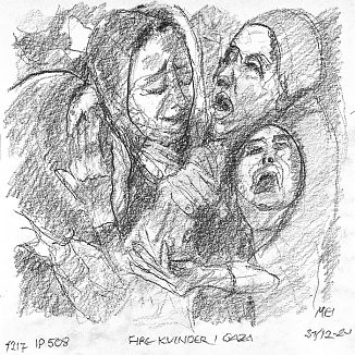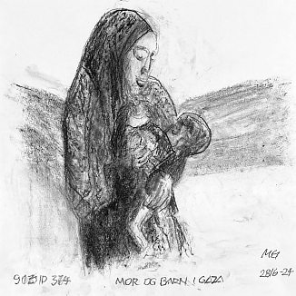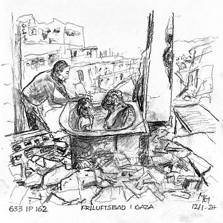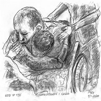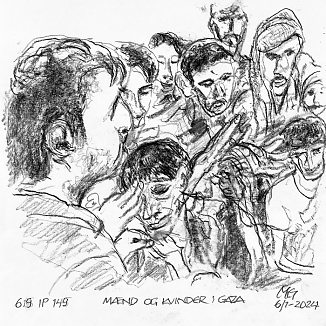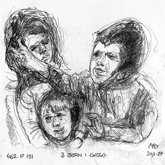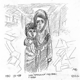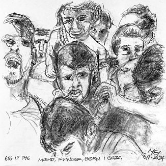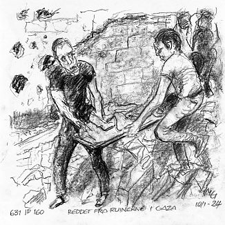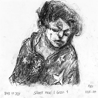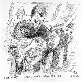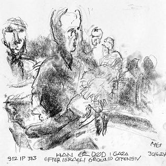 Den nådesløse krig i Gaza-striben mellem Israel og palæstinenserne fortsætter. Tegningerne skildrer den palæstinensiske befolknings lidelser, ødelæggelser af beboelser, skoler, hospitaler, moskéer, kirker og infrastrukturer. Der er katastrofal mangel på el, brændstof, mad vand, medicin og hjælpemidler. Begivenhederne er oplevet gennem tv og pressebilleder.
