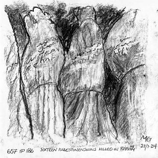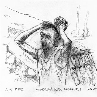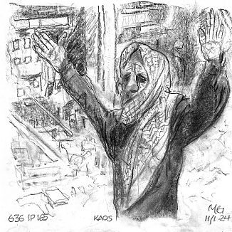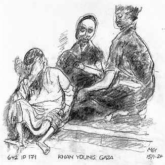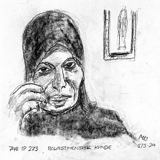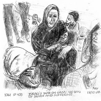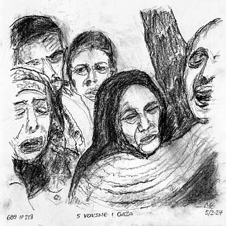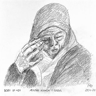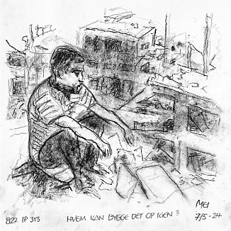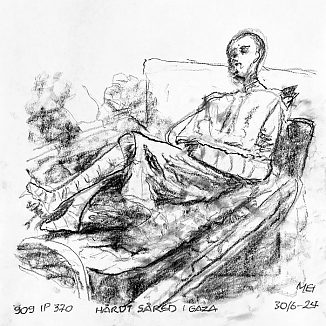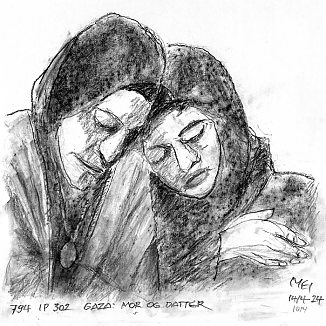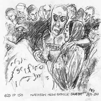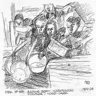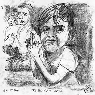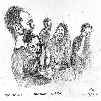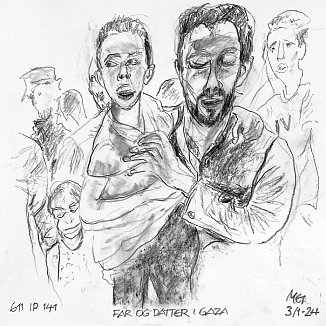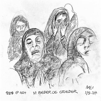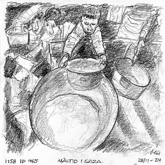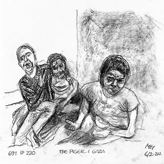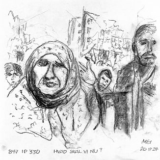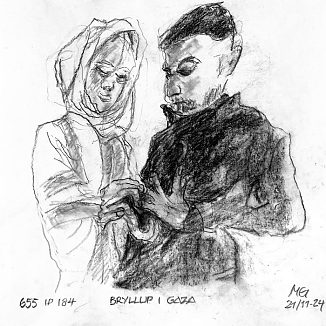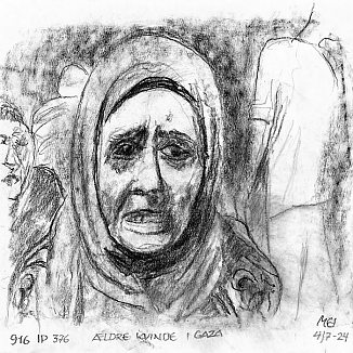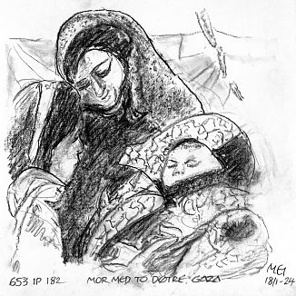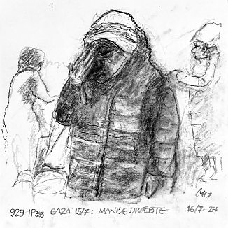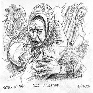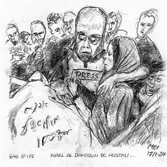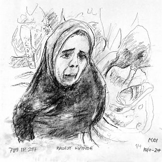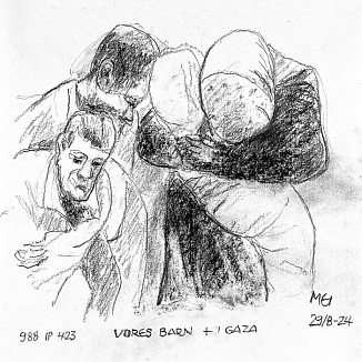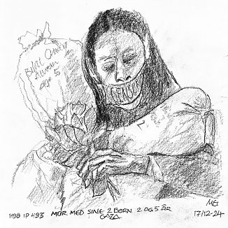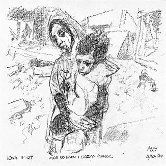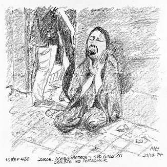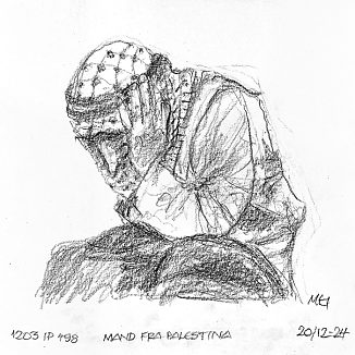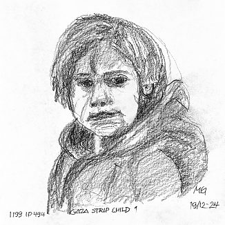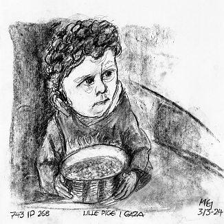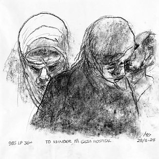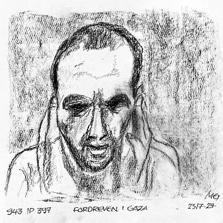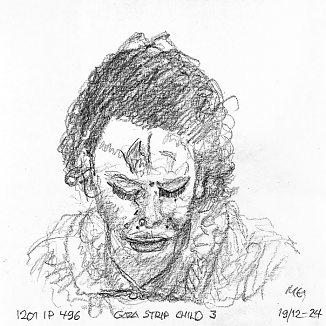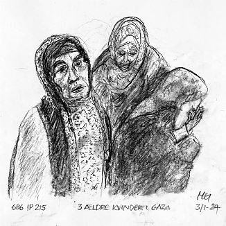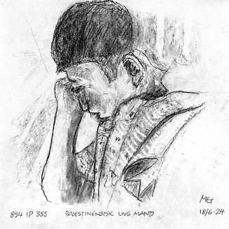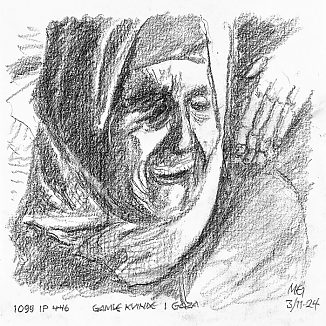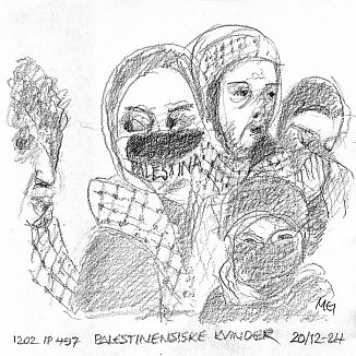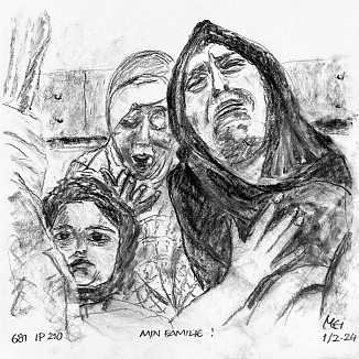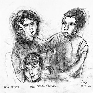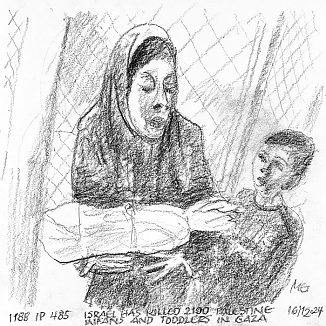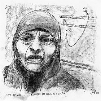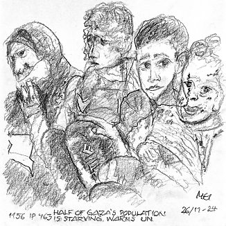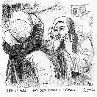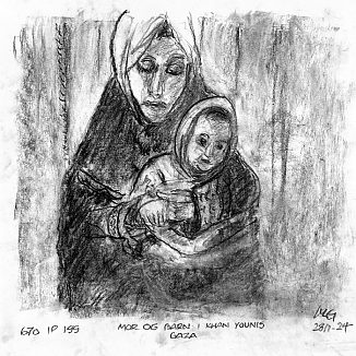 Den nådesløse krig i Gaza-striben mellem Israel og palæstinenserne fortsætter. Tegningerne skildrer den palæstinensiske befolknings lidelser, ødelæggelser af beboelser, skoler, hospitaler, moskéer, kirker og infrastrukturer. Der er katastrofal mangel på el, brændstof, mad vand, medicin og hjælpemidler. Begivenhederne er oplevet gennem tv og pressebilleder.