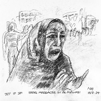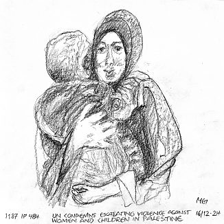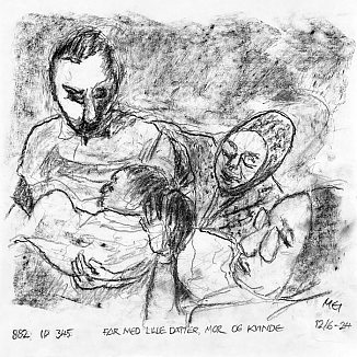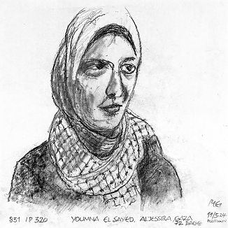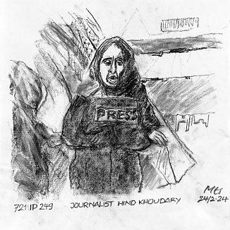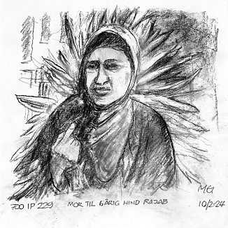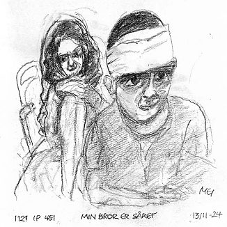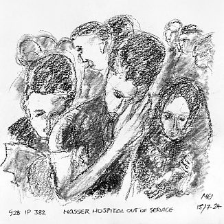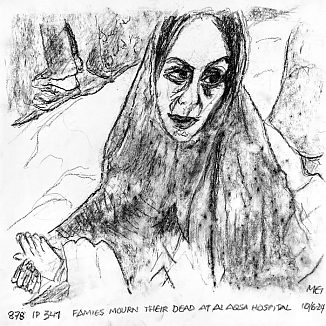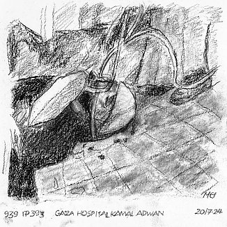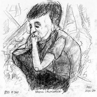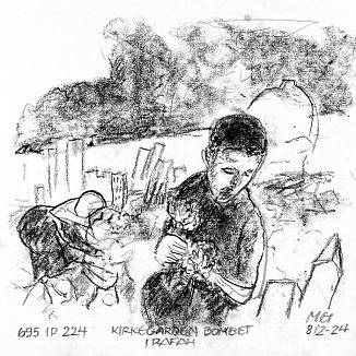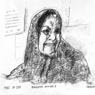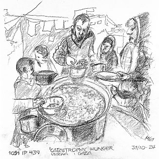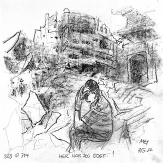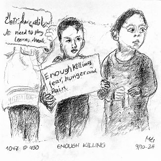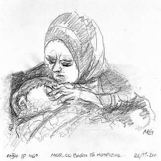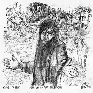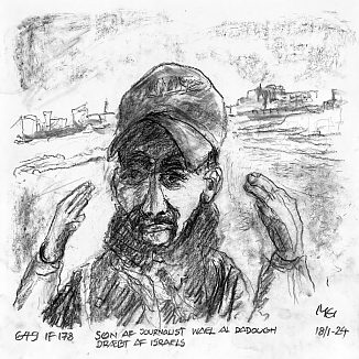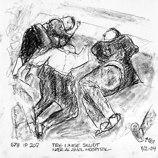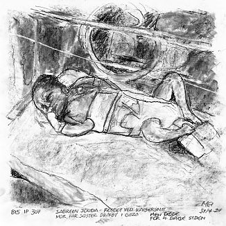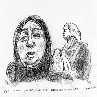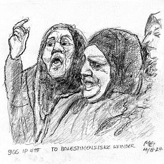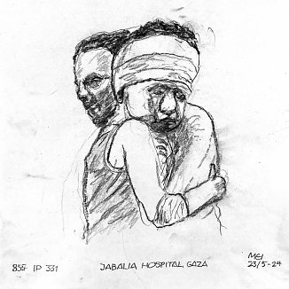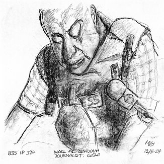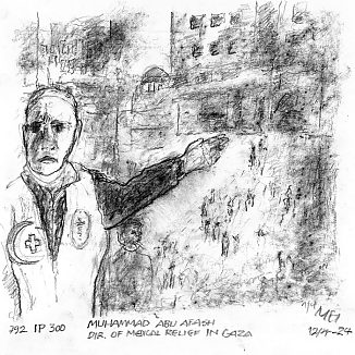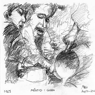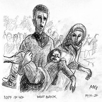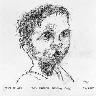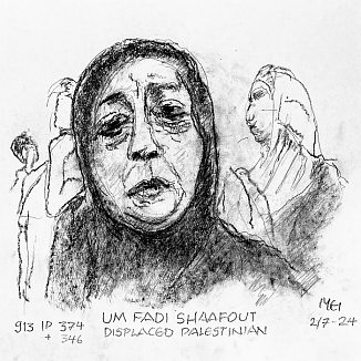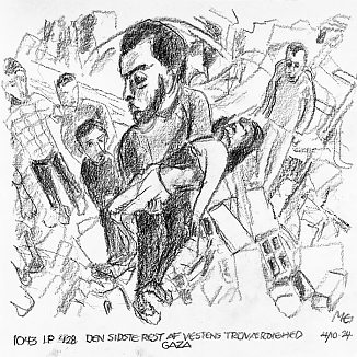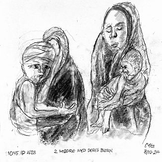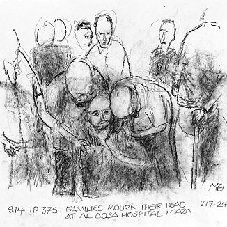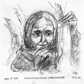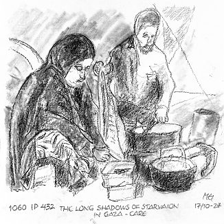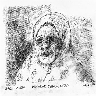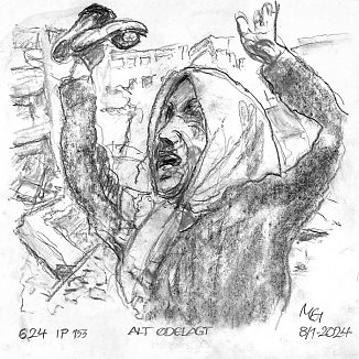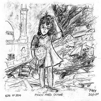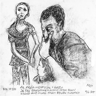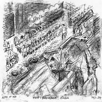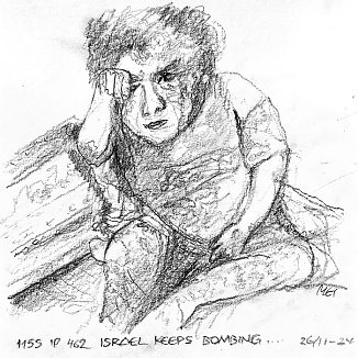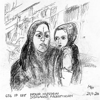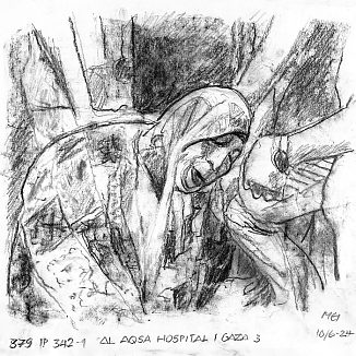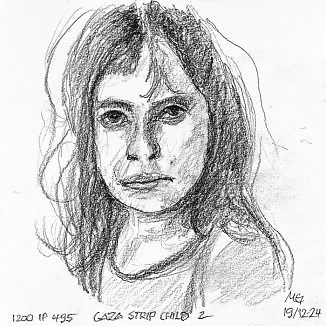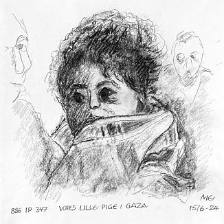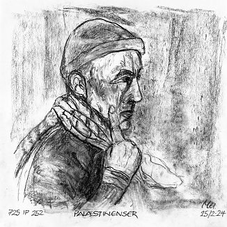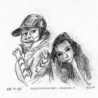 Den nådesløse krig i Gaza-striben mellem Israel og palæstinenserne fortsætter. Tegningerne skildrer den palæstinensiske befolknings lidelser, ødelæggelser af beboelser, skoler, hospitaler, moskéer, kirker og infrastrukturer. Der er katastrofal mangel på el, brændstof, mad vand, medicin og hjælpemidler. Begivenhederne er oplevet gennem tv og pressebilleder.
