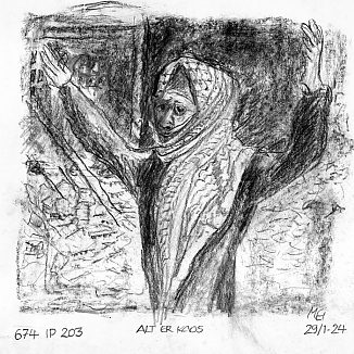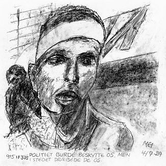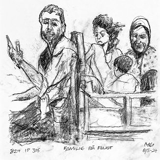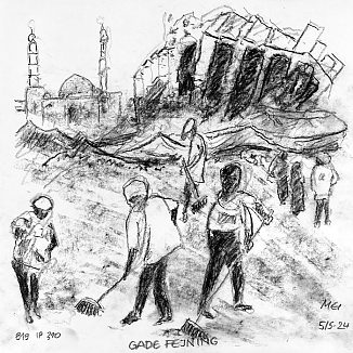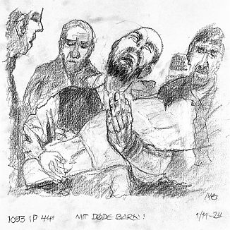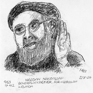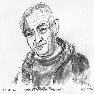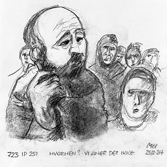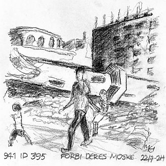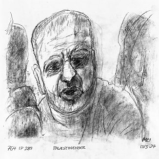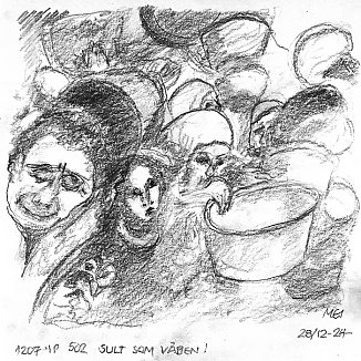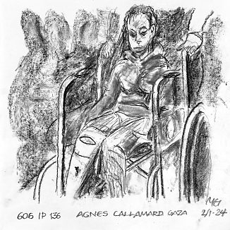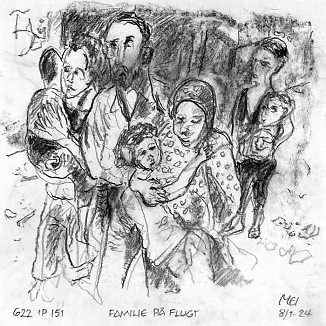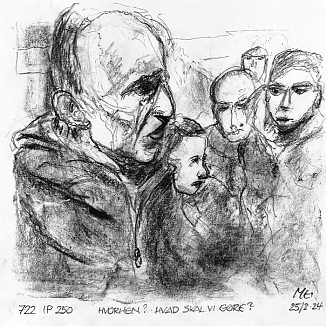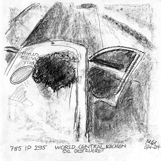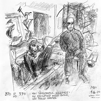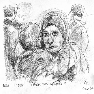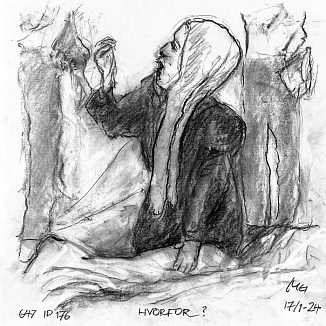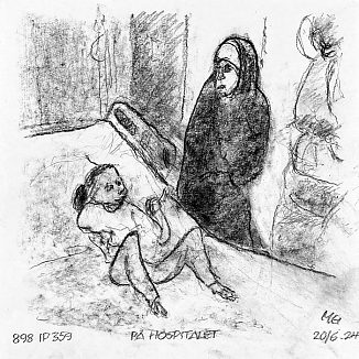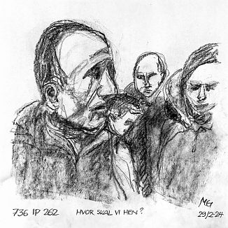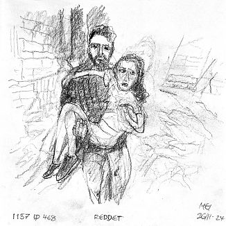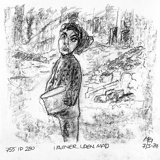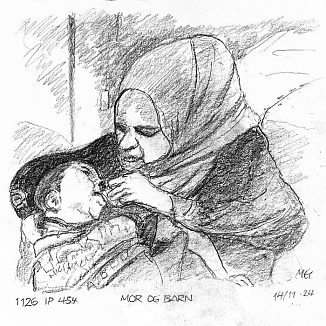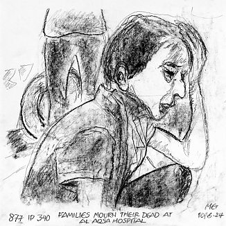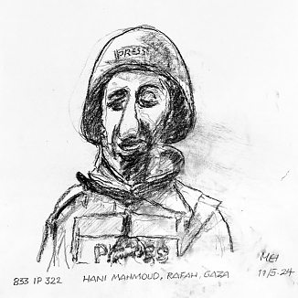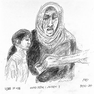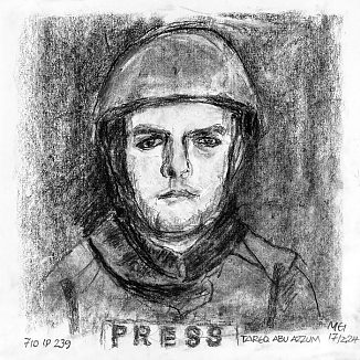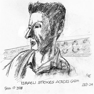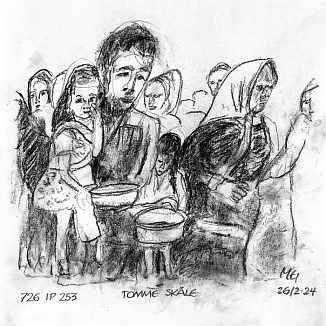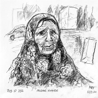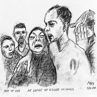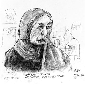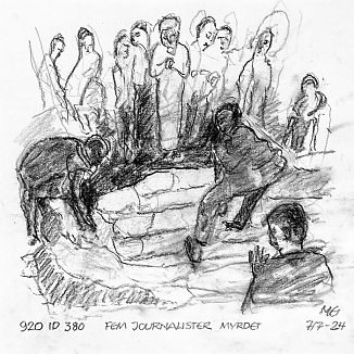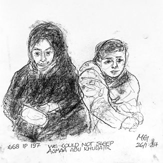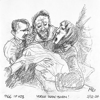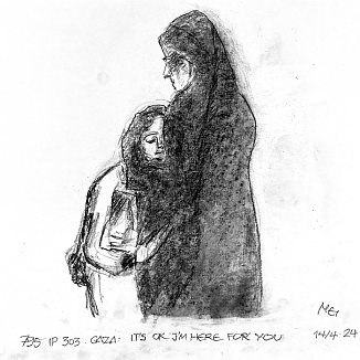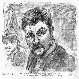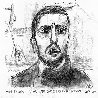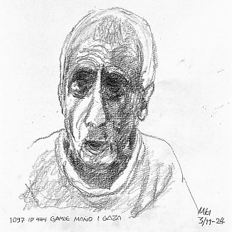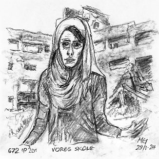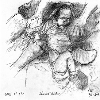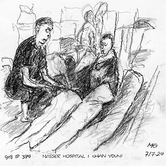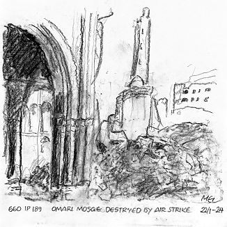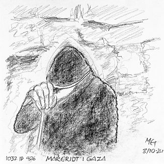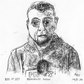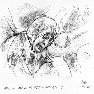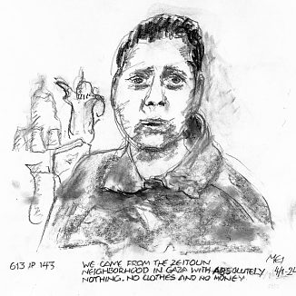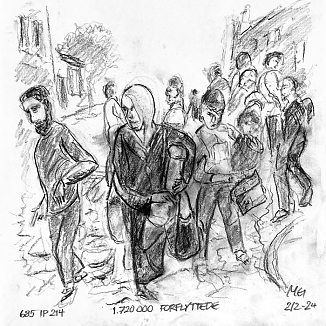 Den nådesløse krig i Gaza-striben mellem Israel og palæstinenserne fortsætter. Tegningerne skildrer den palæstinensiske befolknings lidelser, ødelæggelser af beboelser, skoler, hospitaler, moskéer, kirker og infrastrukturer. Der er katastrofal mangel på el, brændstof, mad vand, medicin og hjælpemidler. Begivenhederne er oplevet gennem tv og pressebilleder.
