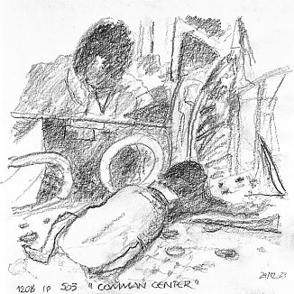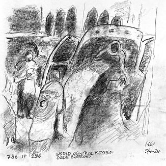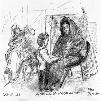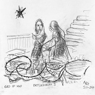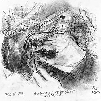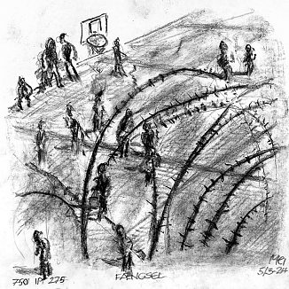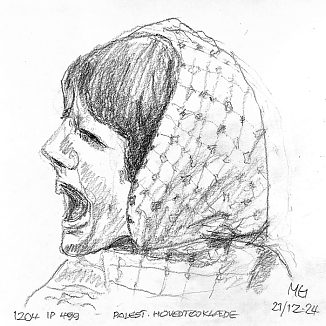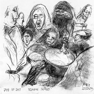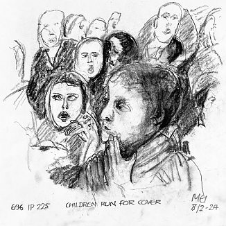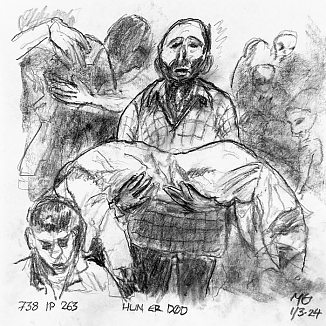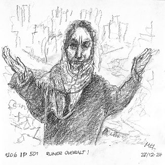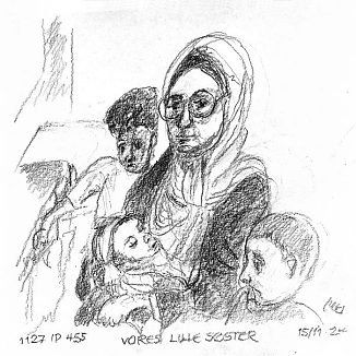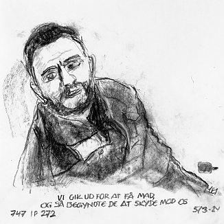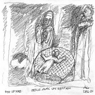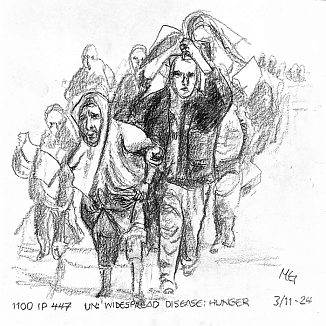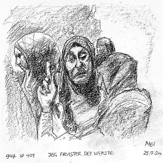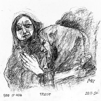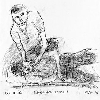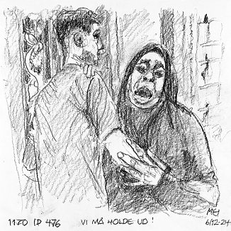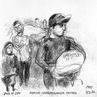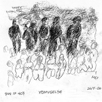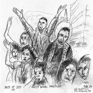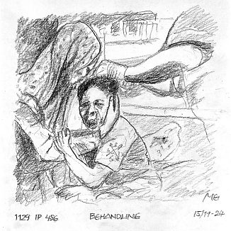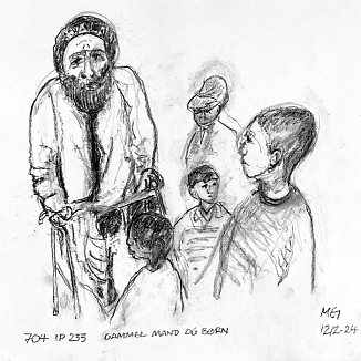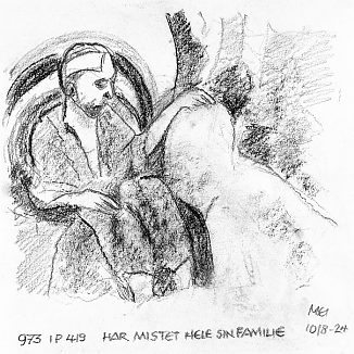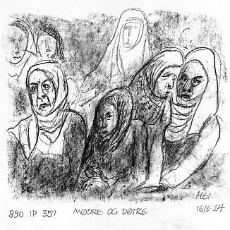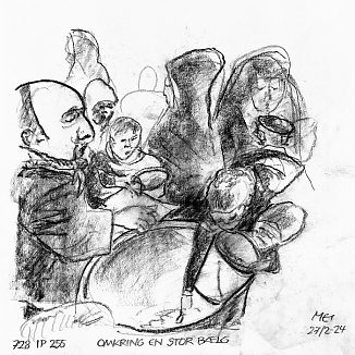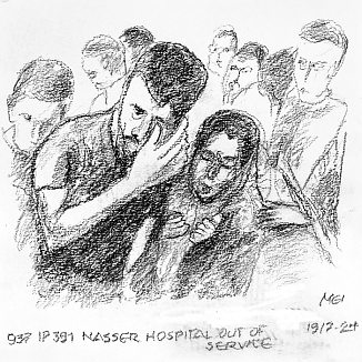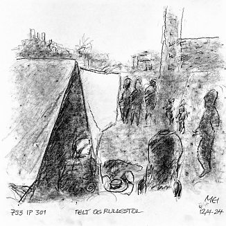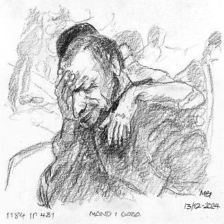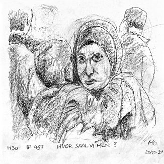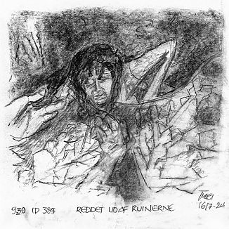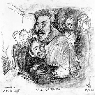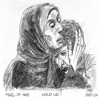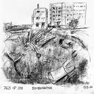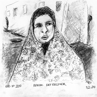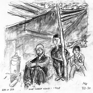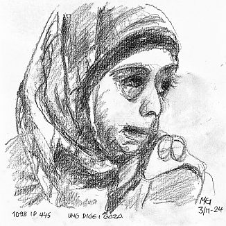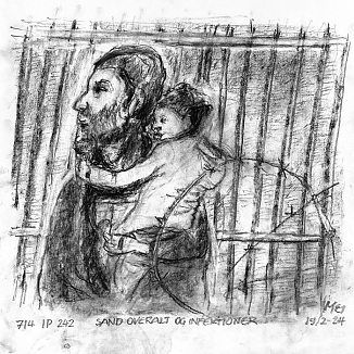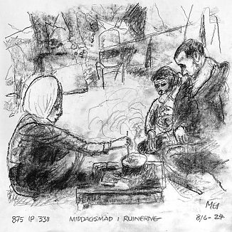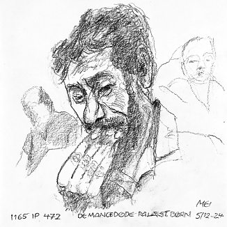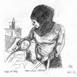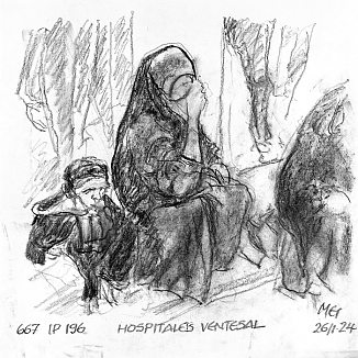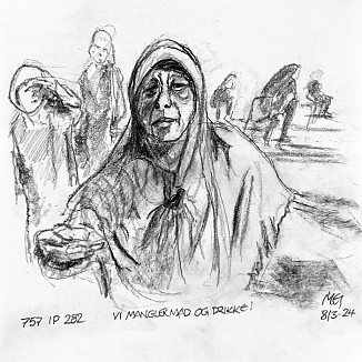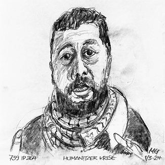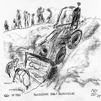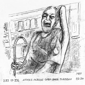 Den nådesløse krig i Gaza-striben mellem Israel og palæstinenserne fortsætter. Tegningerne skildrer den palæstinensiske befolknings lidelser, ødelæggelser af beboelser, skoler, hospitaler, moskéer, kirker og infrastrukturer. Der er katastrofal mangel på el, brændstof, mad vand, medicin og hjælpemidler. Begivenhederne er oplevet gennem tv og pressebilleder.
