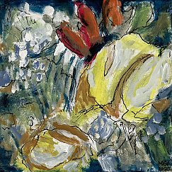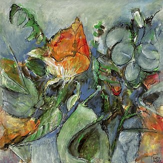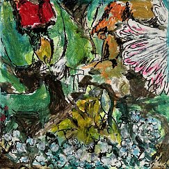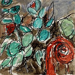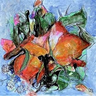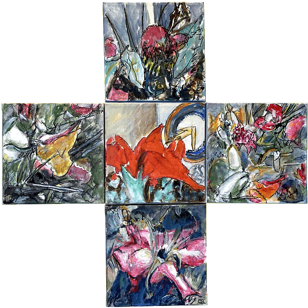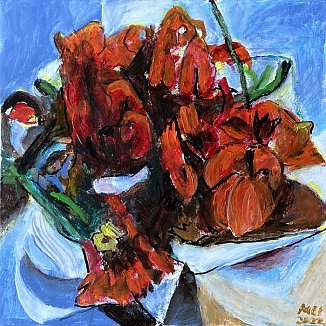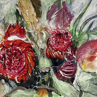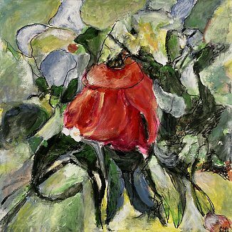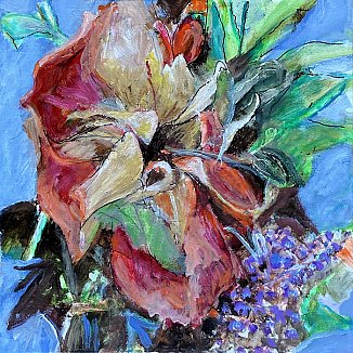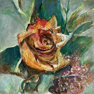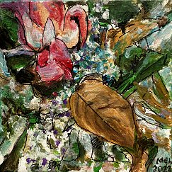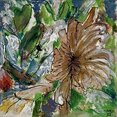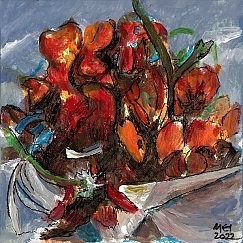 Meister fik en del blomster til sin 90-års fødselsdag i december 2021. Han nænnede ikke at smide dem alle ud, da de var færdige, det var jo minder fra en god dag, men undervejs opdagede han, hvilken skønhed der kan være i forfaldet - og det skulle naturligvis males! Efterfølgende har han haft øje for andre blomster i huset, der er smidt ud, og det er blevet til flere billeder.